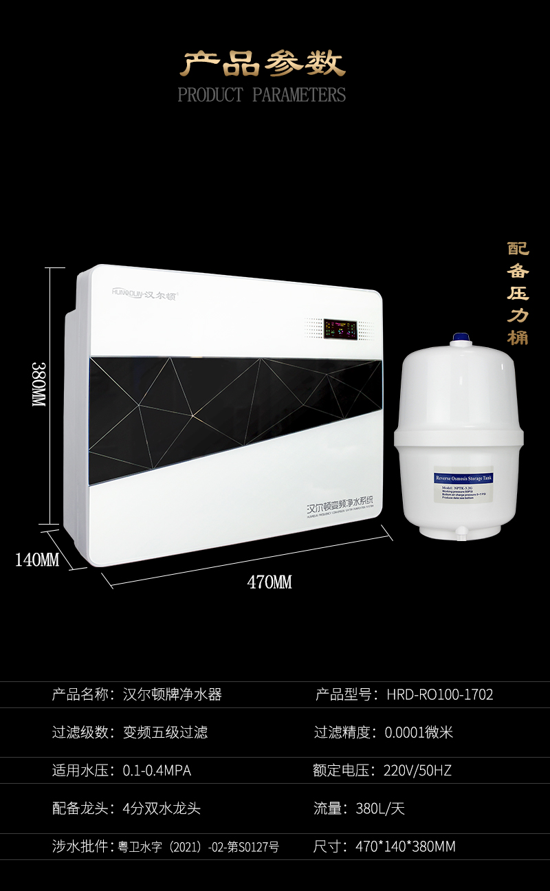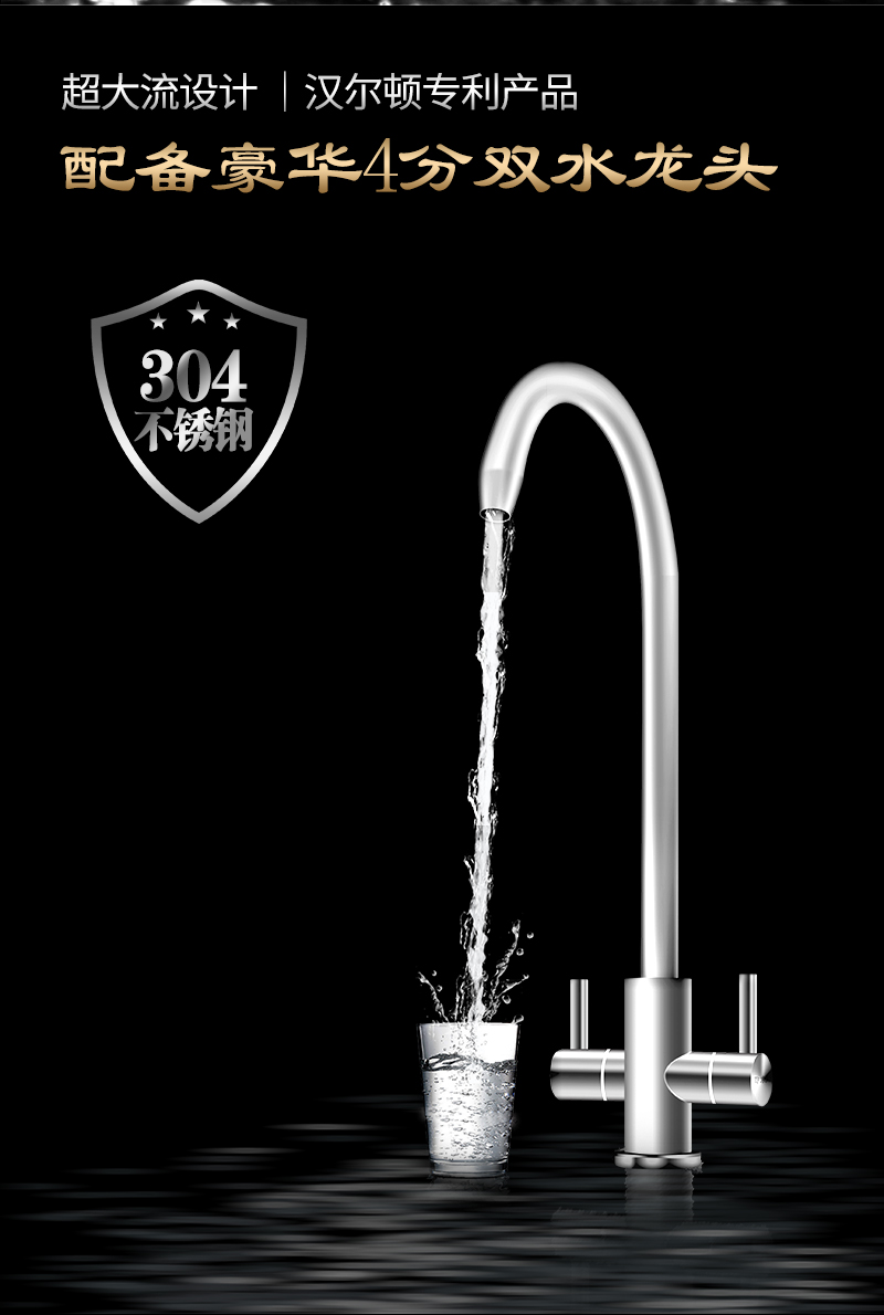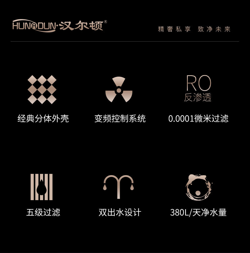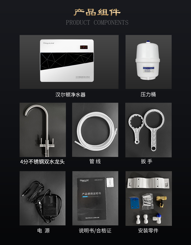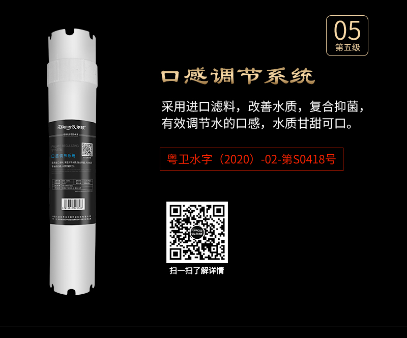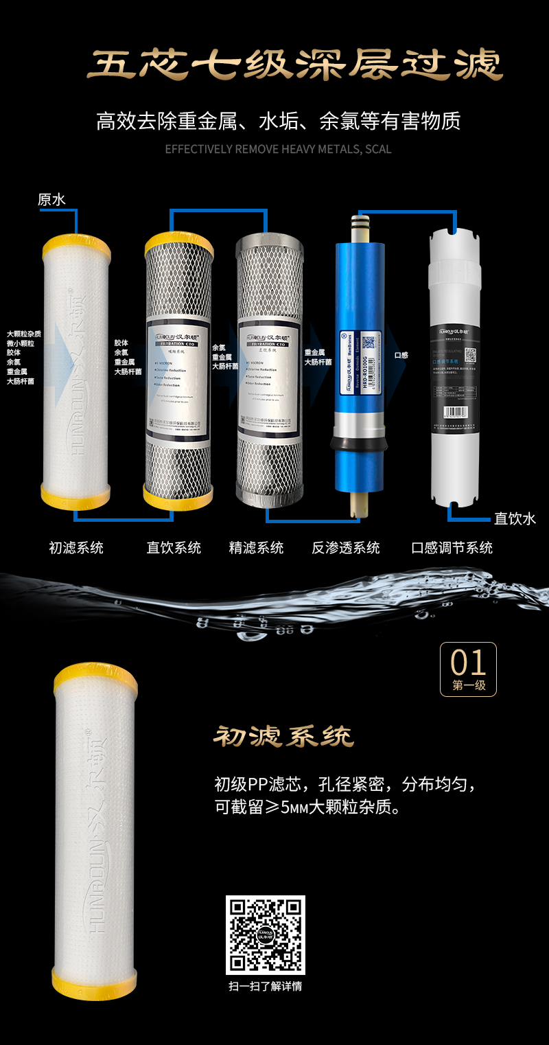 過濾系統(tǒng):初濾系統(tǒng)+初濾系統(tǒng)+直飲系統(tǒng)+反滲透系統(tǒng)+口感系統(tǒng)