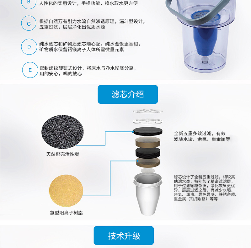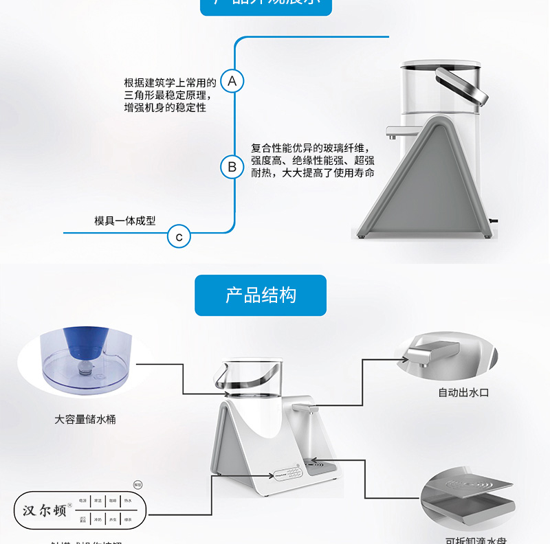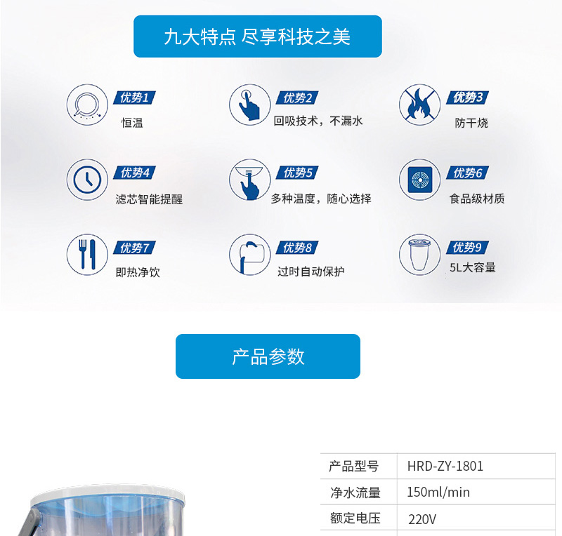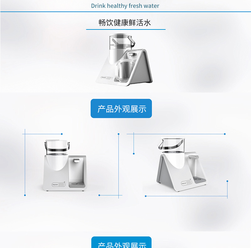 結(jié)構(gòu)功能:加熱一體凈水壺,光米復合超級凈化材料,無需RO膜,TDS直降到0,紫外線自控殺菌、兩秒快速加熱,自動抽水加斷水回吸功能。壺座瞬間斷水分離技術(shù),移動充電式補充高效殺菌功能。