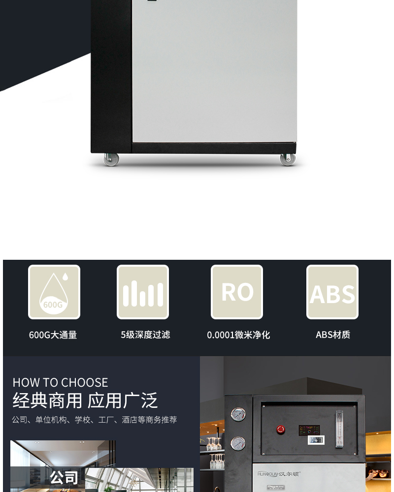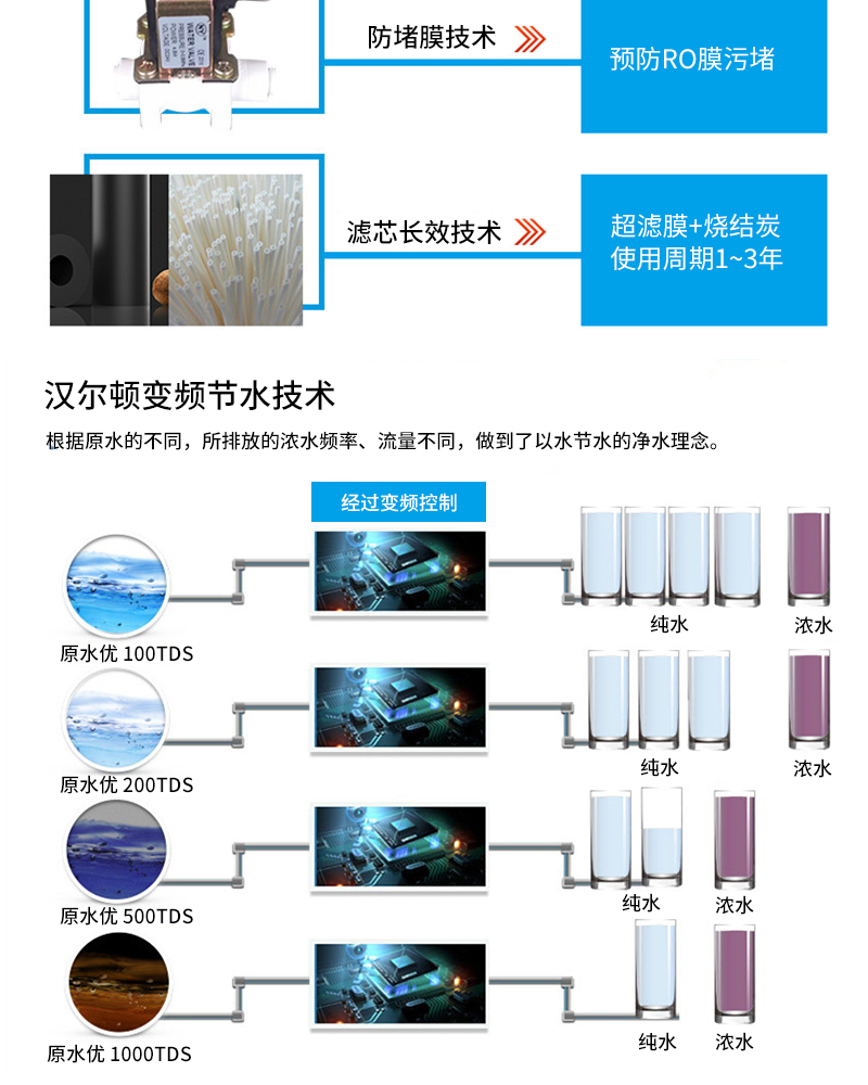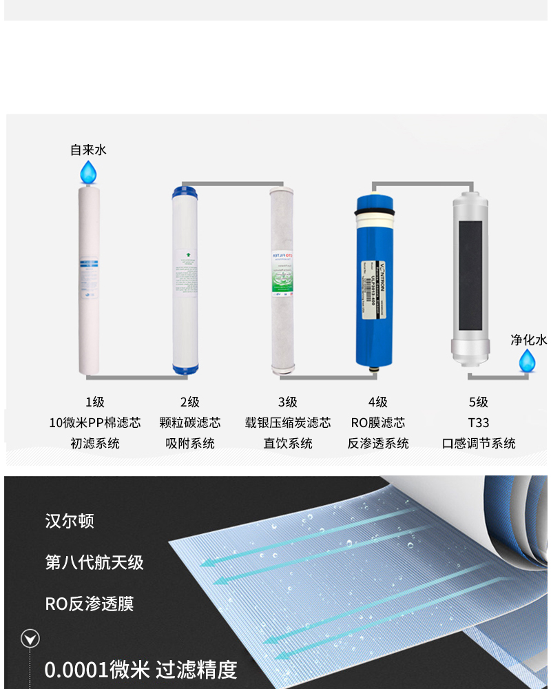 過濾系統(tǒng):初濾系統(tǒng)+吸附系統(tǒng)+直飲系統(tǒng)+反滲透系統(tǒng)+口感系統(tǒng)