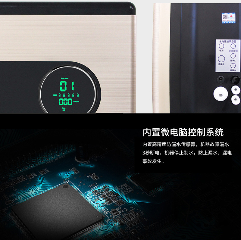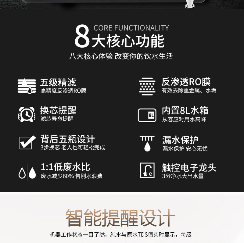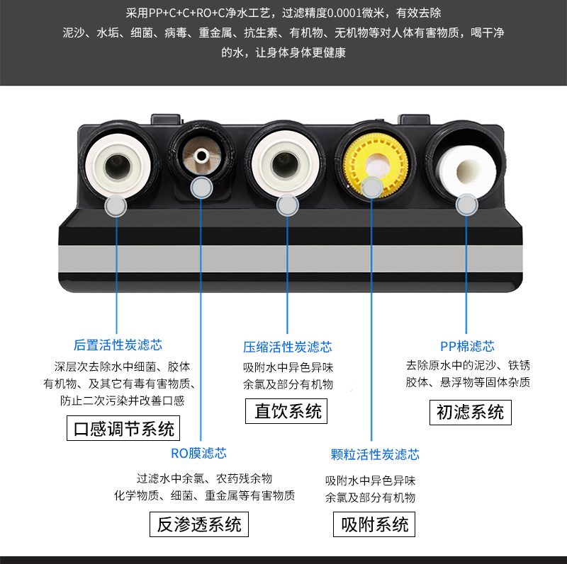 過濾工藝:初濾系統(tǒng)+吸附系統(tǒng)+直飲系統(tǒng)+反滲透系統(tǒng)+口感調(diào)節(jié)系統(tǒng)
