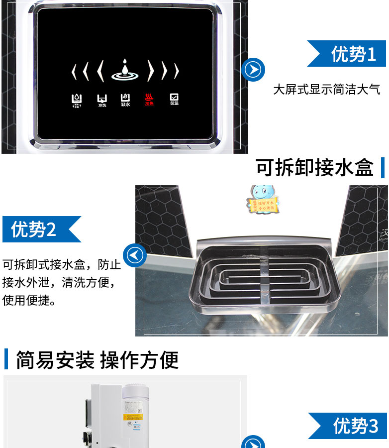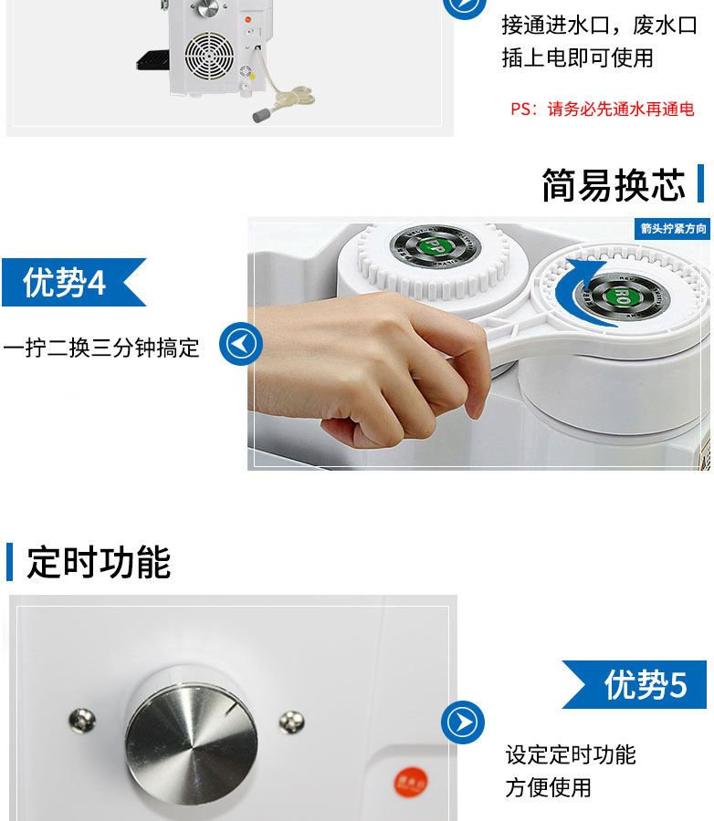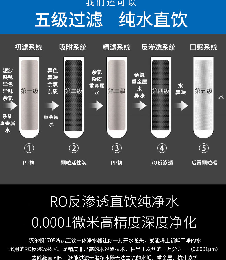 過濾工藝:初濾系統(tǒng)+吸附系統(tǒng)+直飲系統(tǒng)+反滲透系統(tǒng)+口感調(diào)節(jié)系統(tǒng)