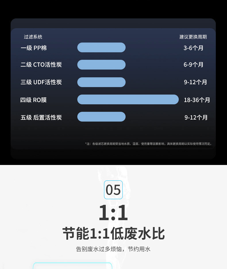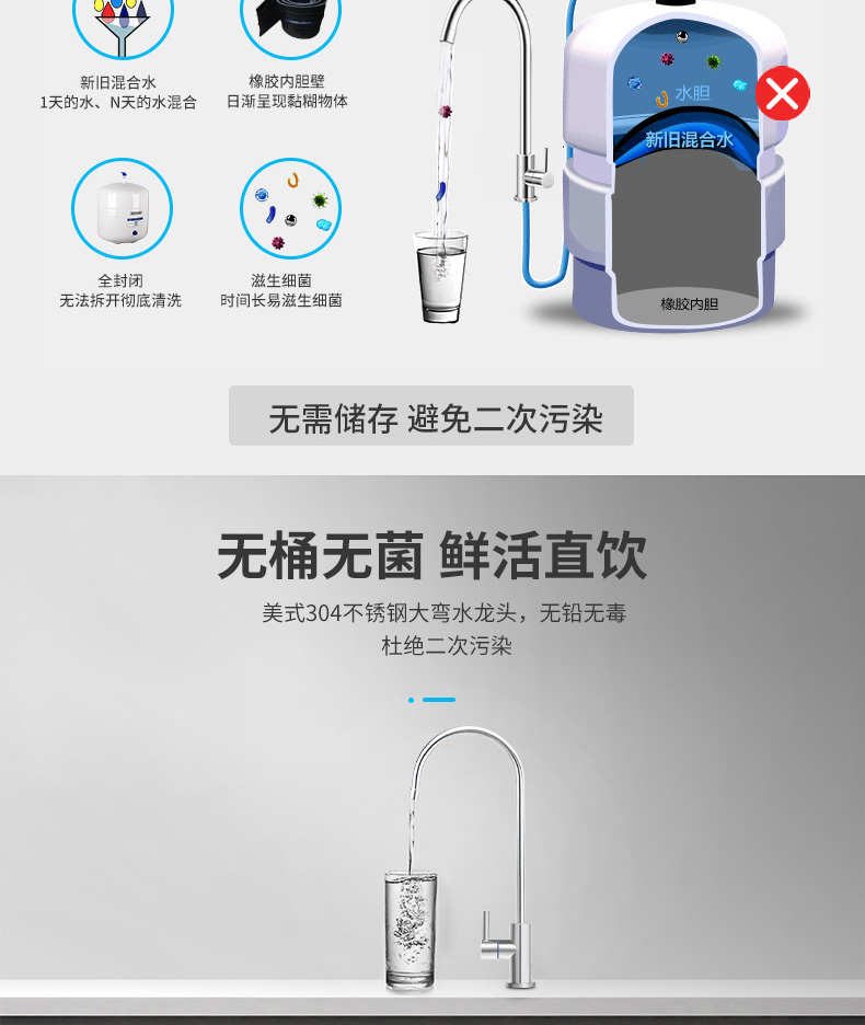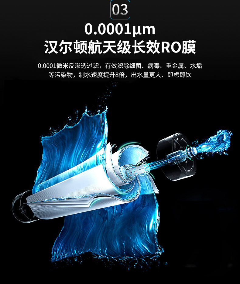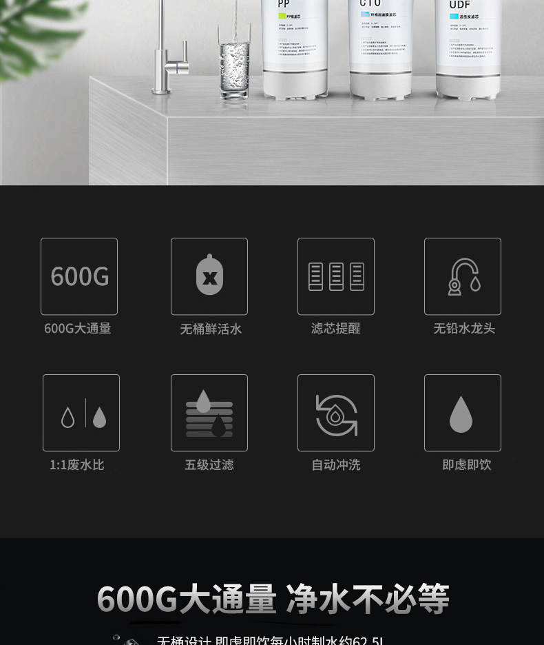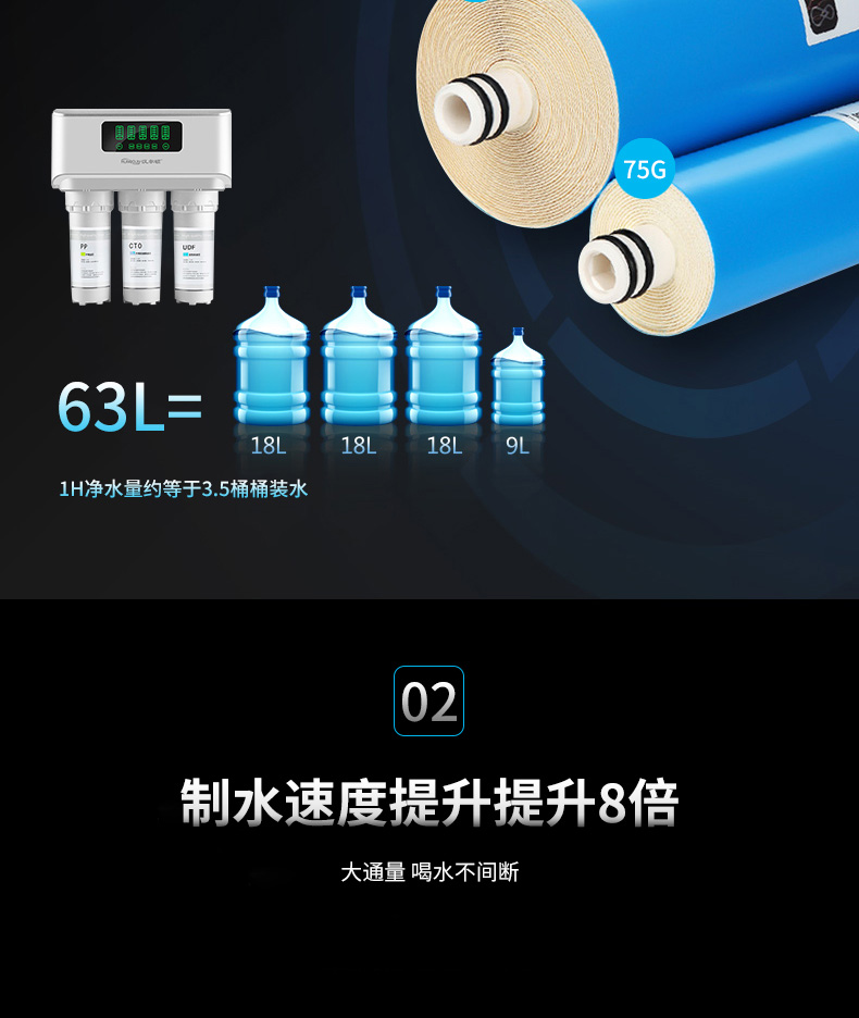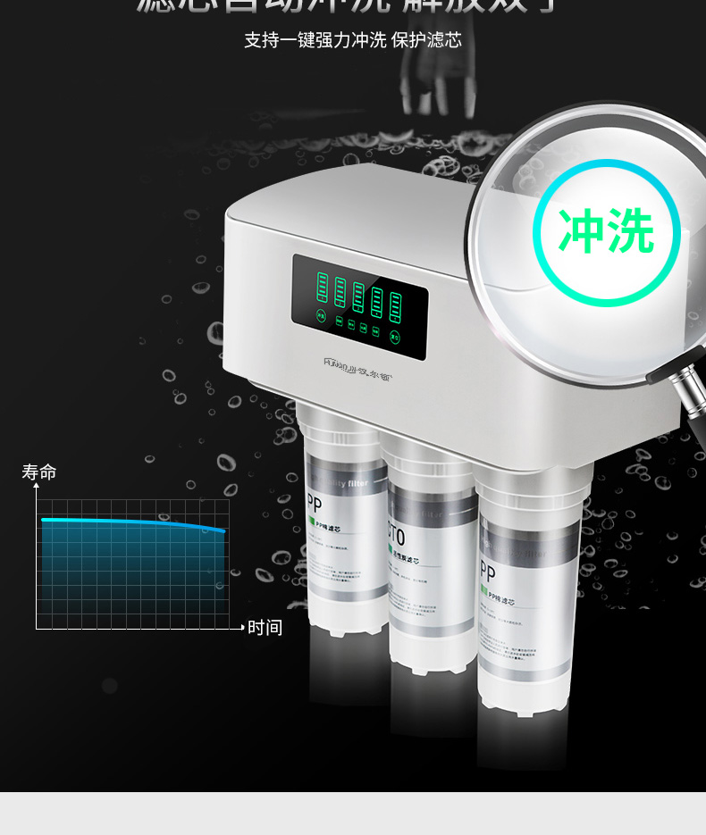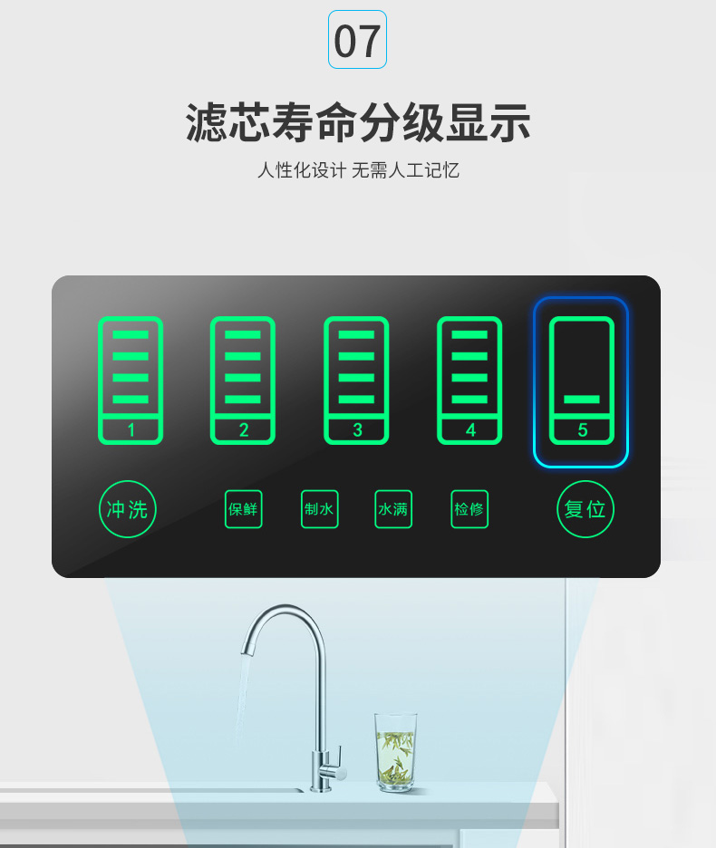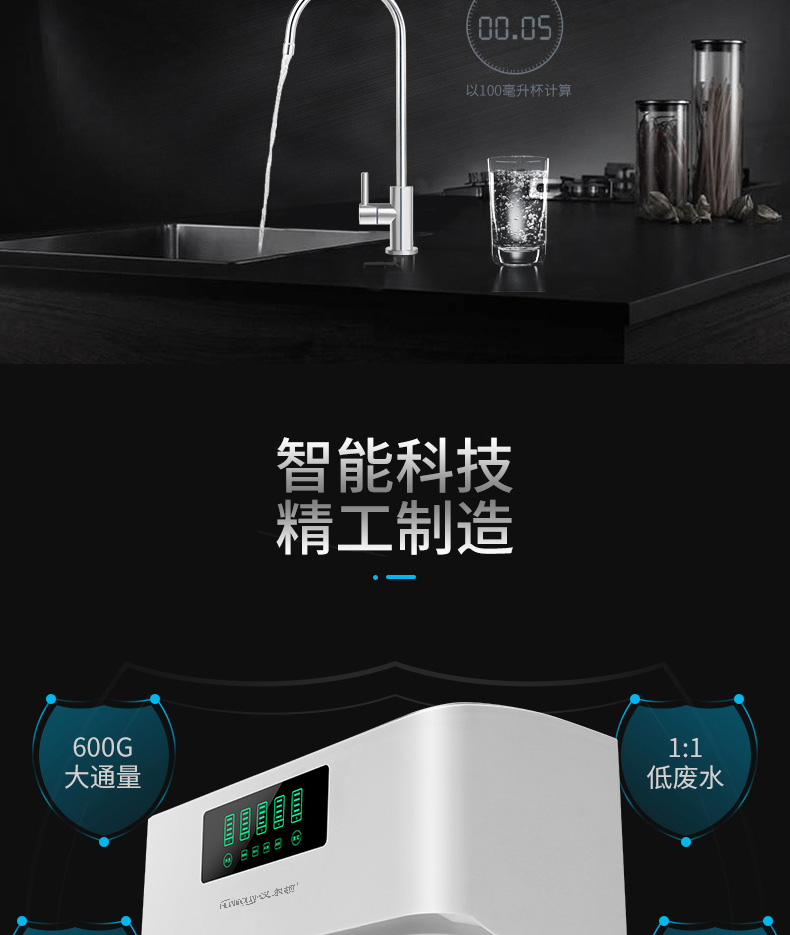 過濾工藝:初濾系統(tǒng)+吸附系統(tǒng)+直飲系統(tǒng)+反滲透系統(tǒng)+口感調(diào)節(jié)系統(tǒng)