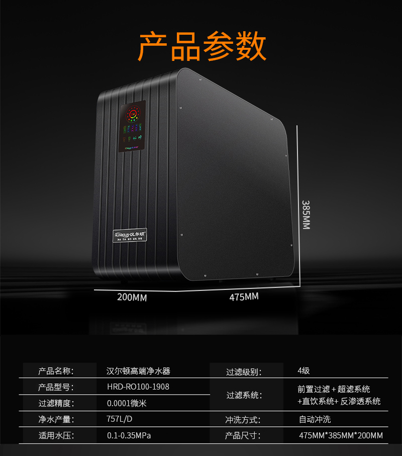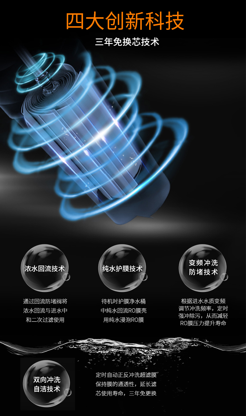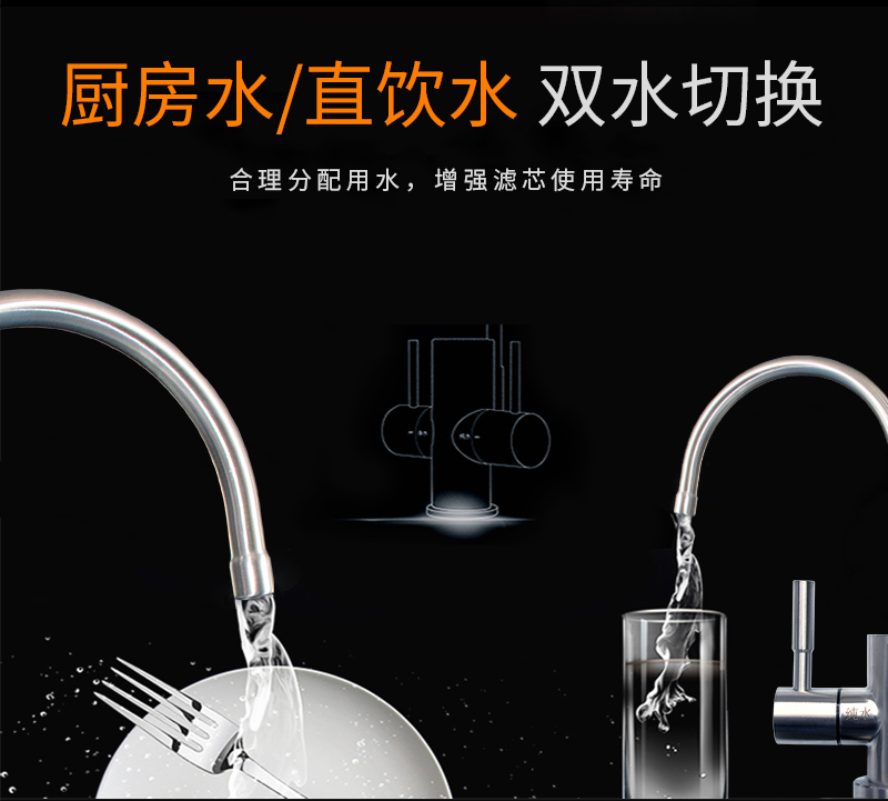 過濾系統(tǒng):前置過濾+超濾系統(tǒng)+直飲系統(tǒng)+反滲透系統(tǒng)