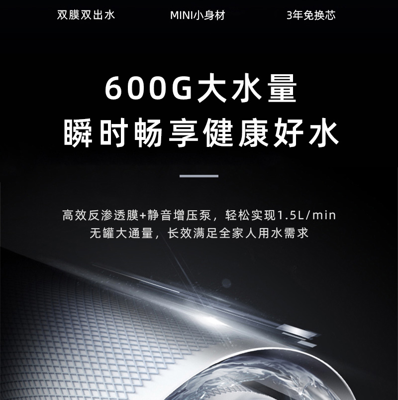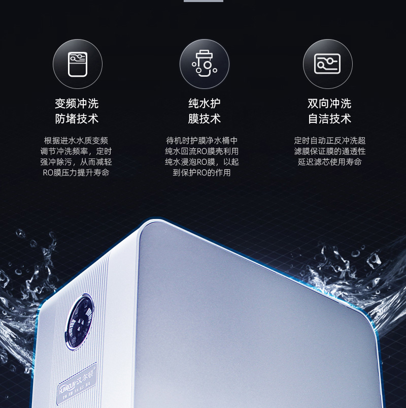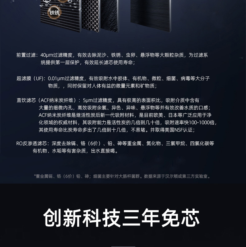 過濾系統(tǒng):前置過濾+超系統(tǒng)+直飲系統(tǒng)+反滲透系統(tǒng)