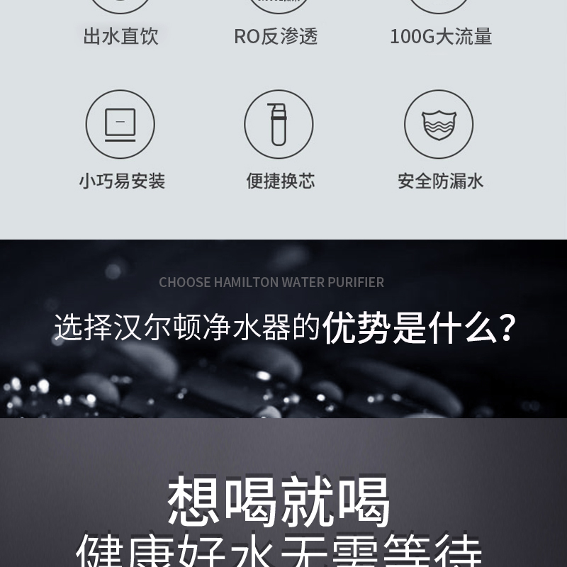 結(jié)構(gòu):豪華一體外殼,獨立研發(fā)自主微控系統(tǒng),自動變頻調(diào)節(jié),自帶數(shù)字多功能顯示 過濾工藝:初濾系統(tǒng)+直飲系統(tǒng)+反滲透系統(tǒng)+口感調(diào)節(jié)系統(tǒng)