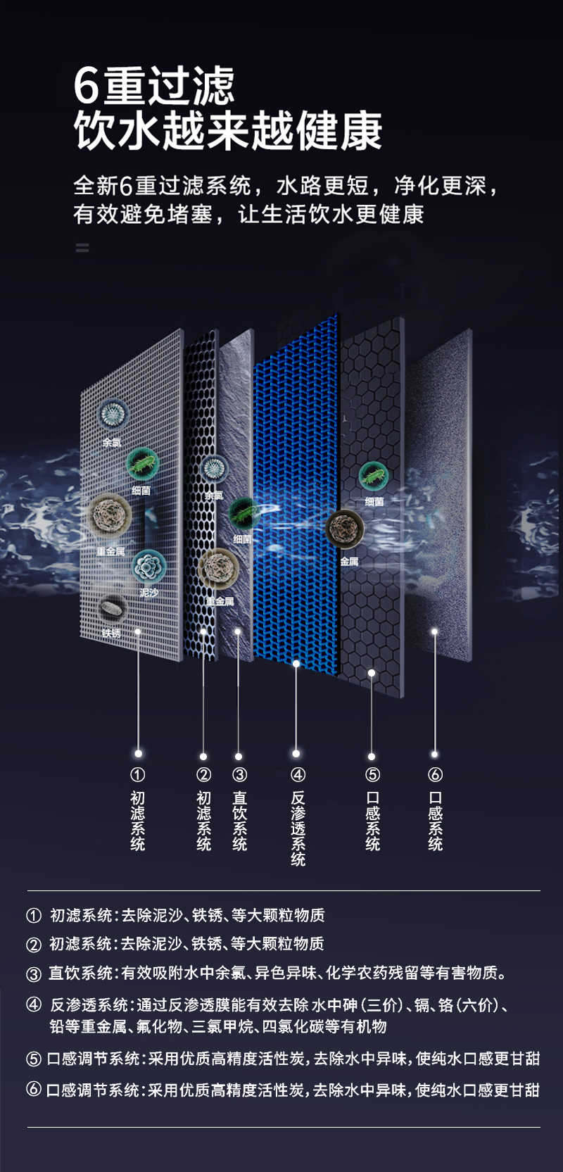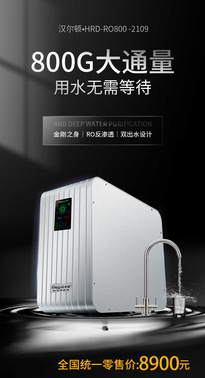 過濾工藝:初濾過濾+直飲系統(tǒng)+反滲透系統(tǒng)+口感調(diào)節(jié)系統(tǒng)
