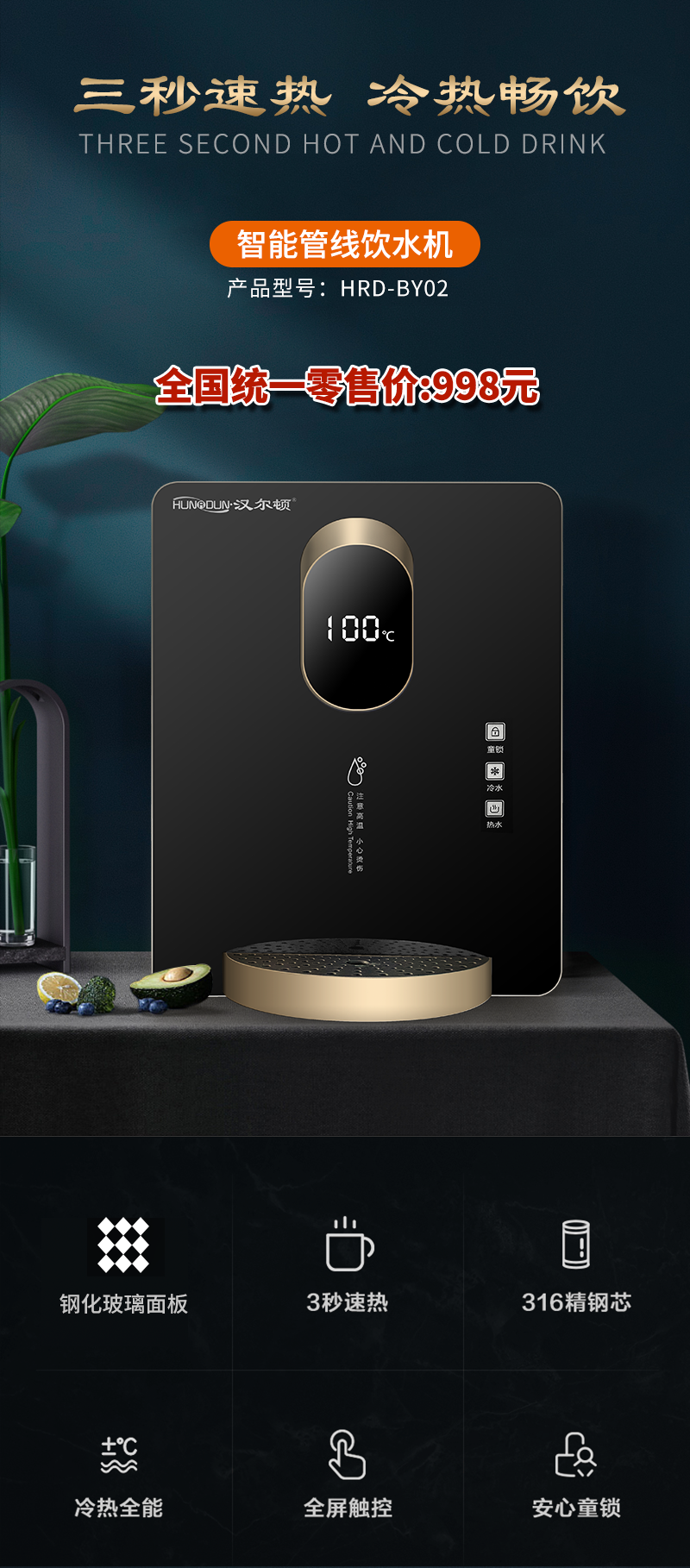 無內(nèi)膽3秒即熱5檔溫度 NVH超靜音設(shè)計 無人值守定量出水超薄機(jī)身 超大液晶顯示屏 鋼化玻璃面板觸摸按鍵